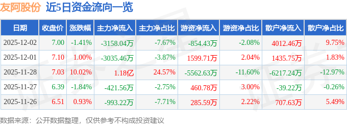 证券之星消息,截至2025年12月2日收盘,友阿股份(002277)报收于7.0元,下跌1.41%,换手率4.2%,成交量58.49万手,成交额4.12亿元。