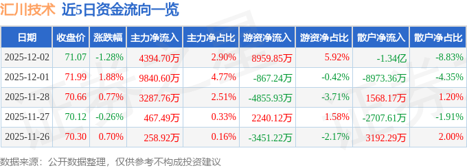证券之星消息,截至2025年12月2日收盘,汇川技术(300124)报收于71.07元,下跌1.28%,换手率0.89%,成交量21.22万手,成交额15.13亿元。