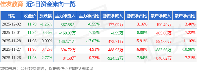 证券之星消息,截至2025年12月2日收盘,佳发教育(300559)报收于11.79元,下跌1.26%,换手率1.53%,成交量4.76万手,成交额5610.04万元。