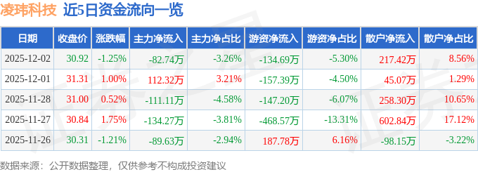 证券之星消息,截至2025年12月2日收盘,凌玮科技(301373)报收于30.92元,下跌1.25%,换手率2.13%,成交量8205.0手,成交额2539.05万元。