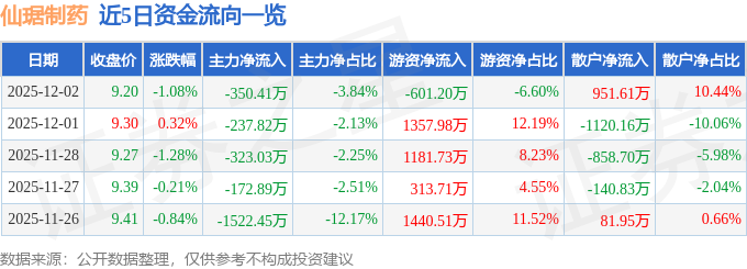 12月2日的资金流向数据方面,主力资金净流出350.41万元,占总成交额3.84%,游资资金净流出601.2万元,占总成交额6.6%,散户资金净流入951.61万元,占总成交额10.44%。