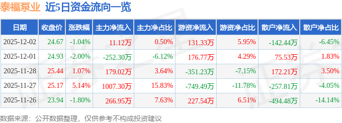 证券之星消息,截至2025年12月2日收盘,泰福泵业(300992)报收于24.67元,下跌1.04%,换手率1.16%,成交量8951.0手,成交额2207.74万元。