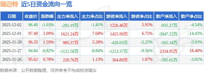 证券之星消息,截至2025年12月2日收盘,瑞迈特(301367)报收于96.4元,下跌1.03%,换手率3.04%,成交量2.13万手,成交额2.06亿元。