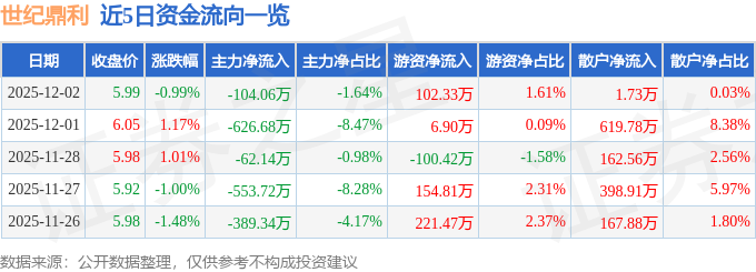 证券之星消息,截至2025年12月2日收盘,世纪鼎利(300050)报收于5.99元,下跌0.99%,换手率1.95%,成交量10.63万手,成交额6351.78万元。