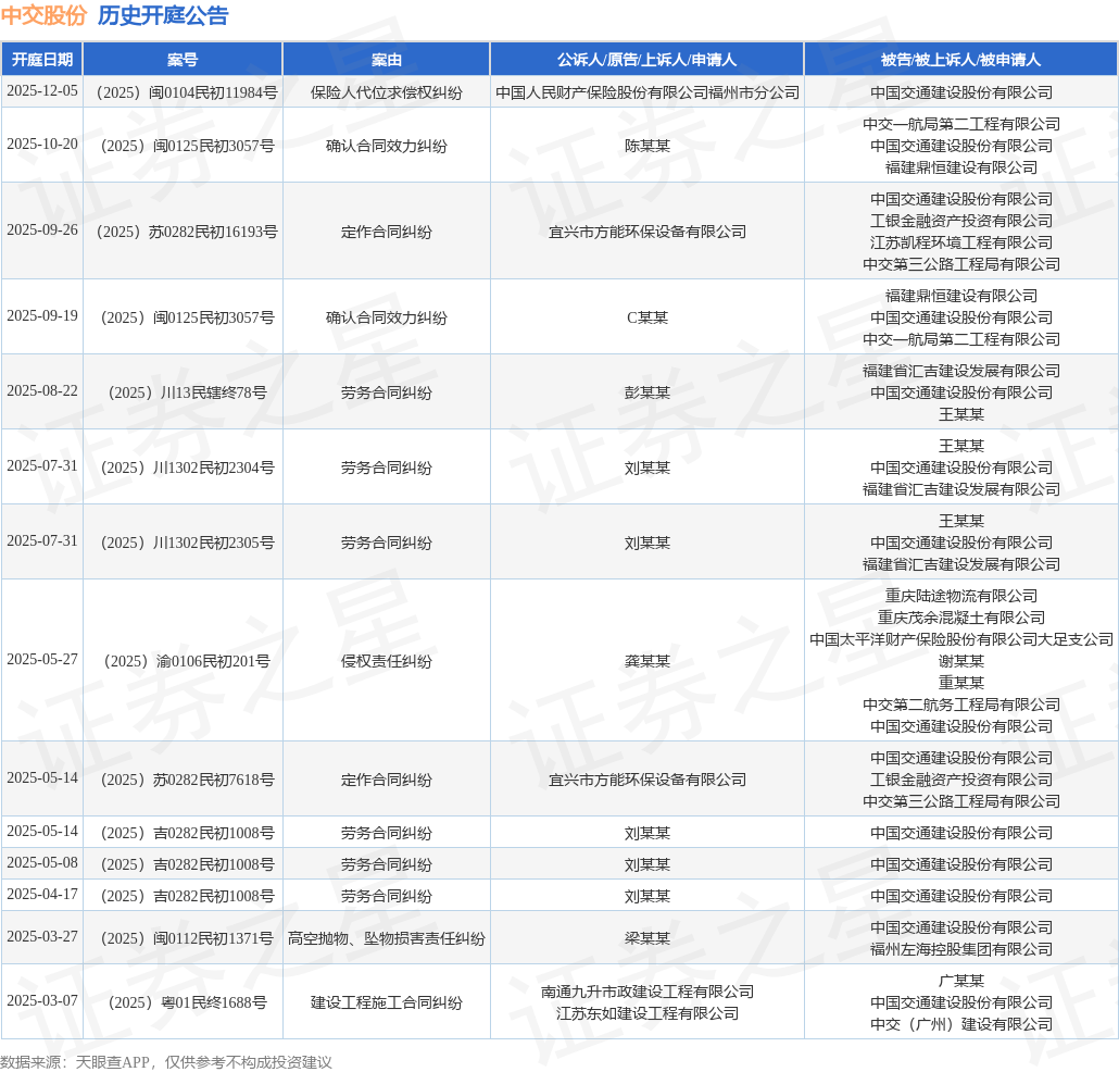 案号:(2025)闽0104民初11984号根据统计,近一年内以中国交通建设股份有限公司为当事人的历史开庭公告有14则,其中案由为“劳务合同纠纷”的公告以6则居首,其次为“定作合同纠纷”有2则,“确认合同效力纠纷”有2则。历史开庭公告如下: