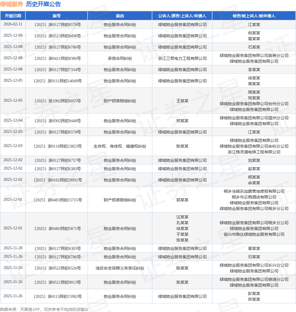 案号:(2025)浙0111民初14049号根据统计,近一年内以绿城物业服务集团有限公司为当事人的历史开庭公告有279则,其中案由为“物业服务合同纠纷”的公告以183则居首,其次为“财产损害赔偿纠纷”有25则,“违反安全保障义务责任纠纷”有9则。历史开庭公告(前20条)如下: