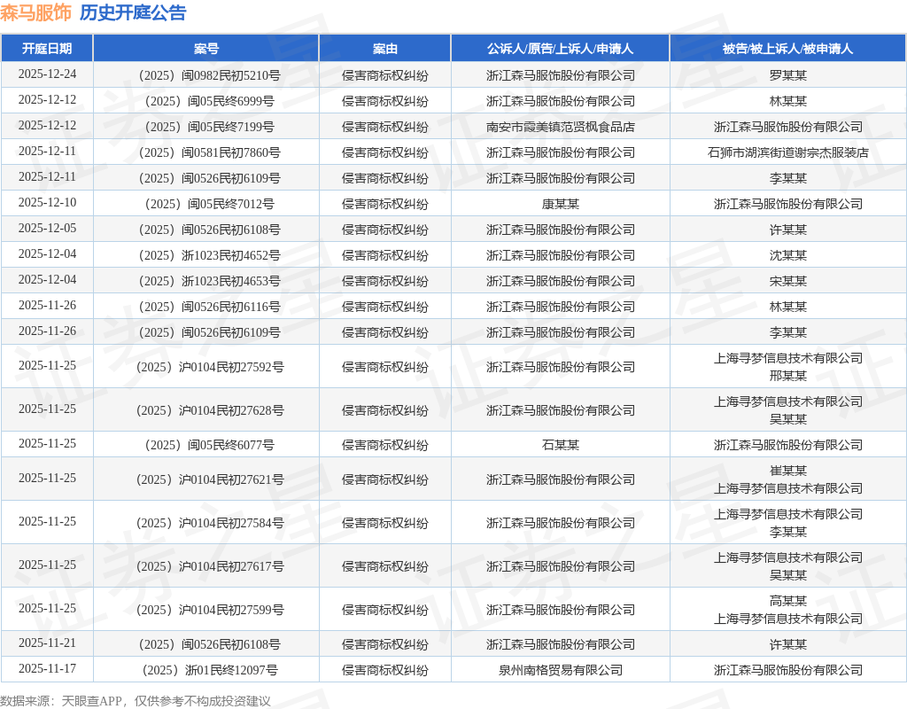 案号:(2025)闽0526民初6108号根据统计,近一年内以浙江森马服饰股份有限公司为当事人的历史开庭公告有52则,其中案由为“侵害商标权纠纷”的公告以45则居首,其次为“侵害商标权”有5则,“侵害商标权及不正当竞争纠纷”有1则。历史开庭公告(前20条)如下: