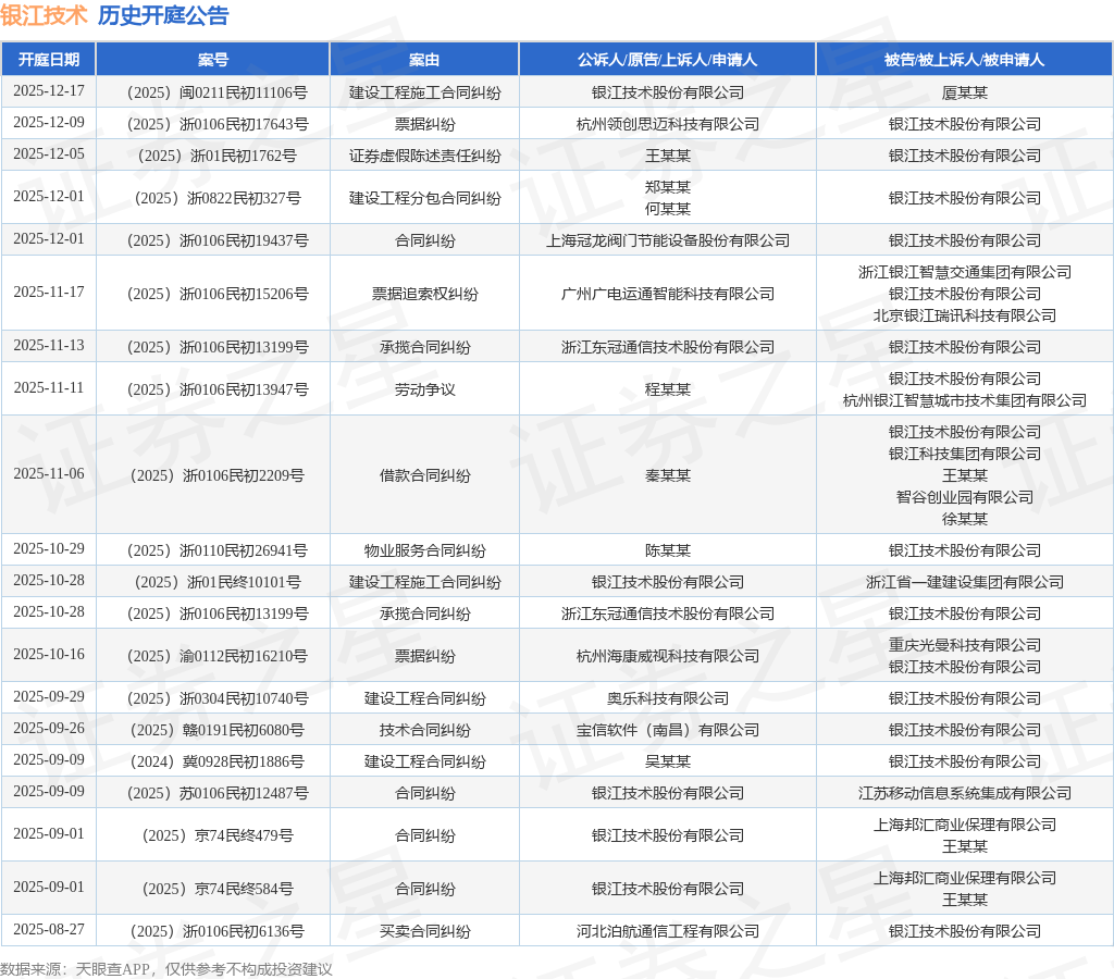 案号:(2025)浙01民初1762号根据统计,近一年内以银江技术股份有限公司为当事人的历史开庭公告有94则,其中案由为“票据追索权纠纷”的公告以13则居首,其次为“合同纠纷”有12则,“劳动争议”有11则。历史开庭公告(前20条)如下: