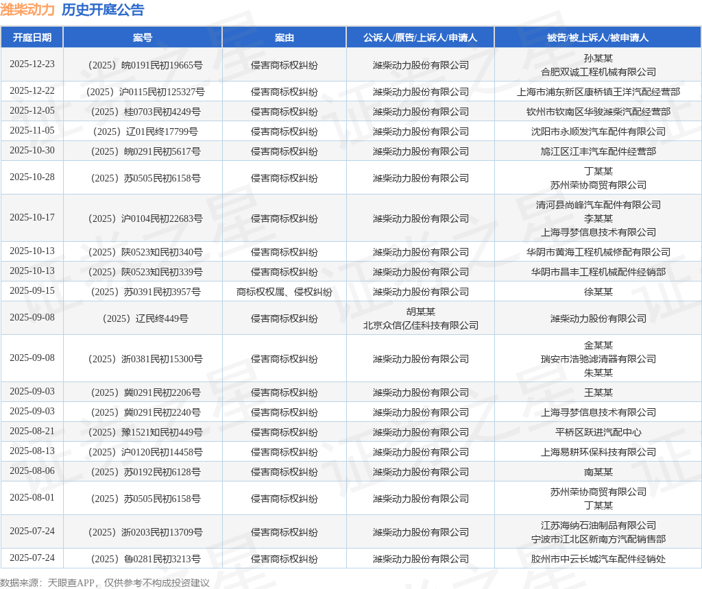案号:(2025)桂0703民初4249号根据统计,近一年内以潍柴动力股份有限公司为当事人的历史开庭公告有77则,其中案由为“侵害商标权纠纷”的公告以55则居首,其次为“买卖合同纠纷”有10则,“商标权权属、侵权纠纷”有6则。历史开庭公告(前20条)如下: