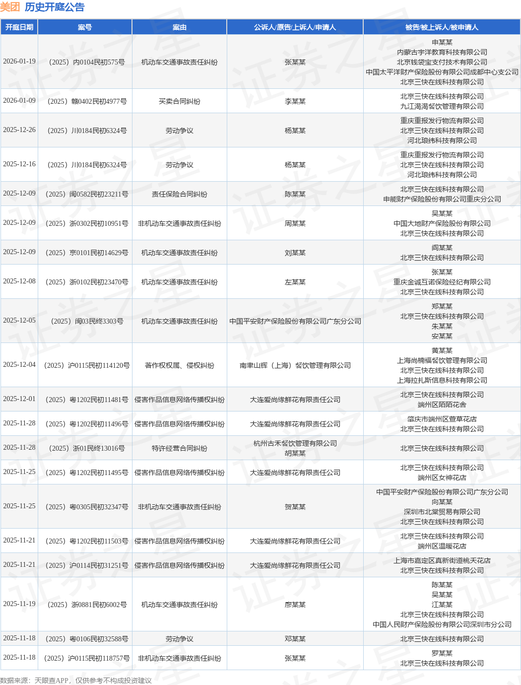 案号:(2025)闽03民终3303号根据统计,近一年内以北京三快在线科技有限公司为当事人的历史开庭公告有441则,其中案由为“非机动车交通事故责任纠纷”的公告以140则居首,其次为“机动车交通事故责任纠纷”有55则,“劳动争议”有50则。历史开庭公告(前20条)如下: