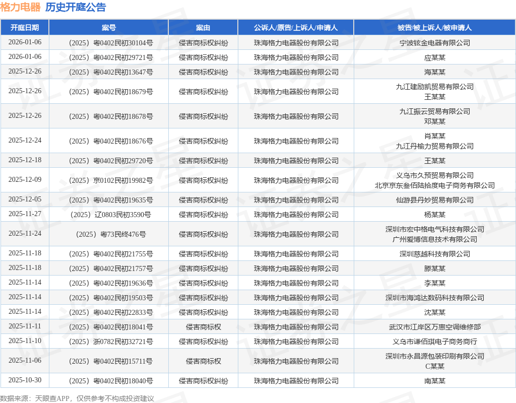 案号:(2025)粤0402民初19635号根据统计,近一年内以珠海格力电器股份有限公司为当事人的历史开庭公告有169则,其中案由为“侵害商标权纠纷”的公告以112则居首,其次为“买卖合同纠纷”有18则,“不正当竞争纠纷”有11则。历史开庭公告(前20条)如下: