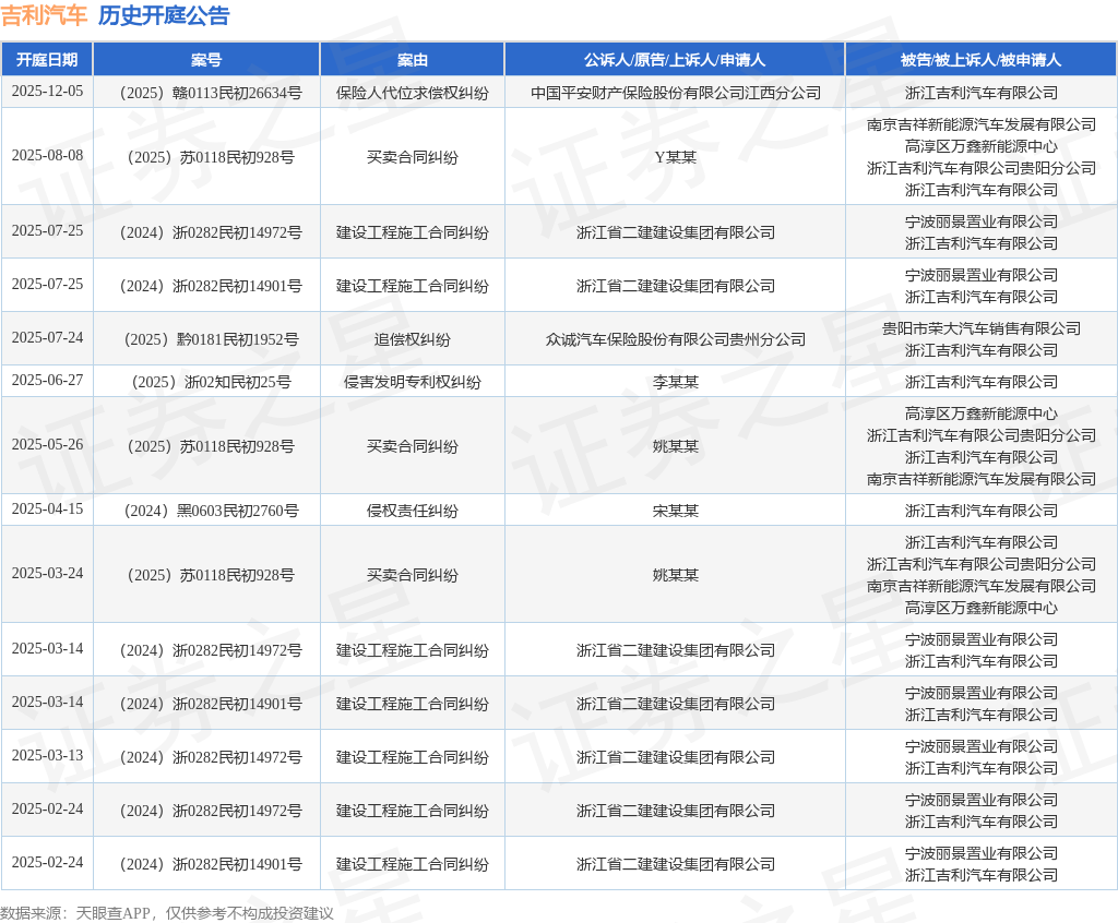 案号:(2025)赣0113民初26634号根据统计,近一年内以浙江吉利汽车有限公司为当事人的历史开庭公告有14则,其中案由为“建设工程施工合同纠纷”的公告以7则居首,其次为“买卖合同纠纷”有3则,“侵害发明专利权纠纷”有1则。历史开庭公告如下: