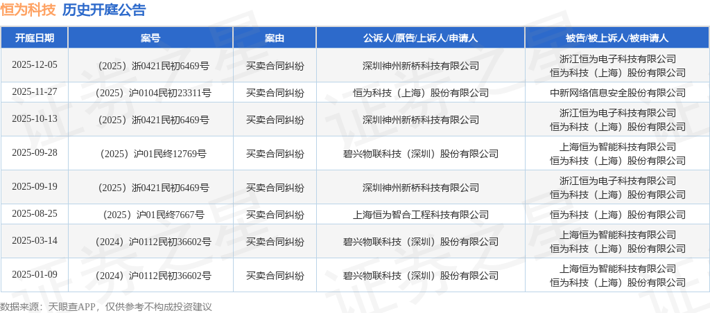 根据统计,近一年内以恒为科技(上海)股份有限公司为当事人的历史开庭公告有8则,其中案由为“买卖合同纠纷”的公告以8则居首。历史开庭公告如下: