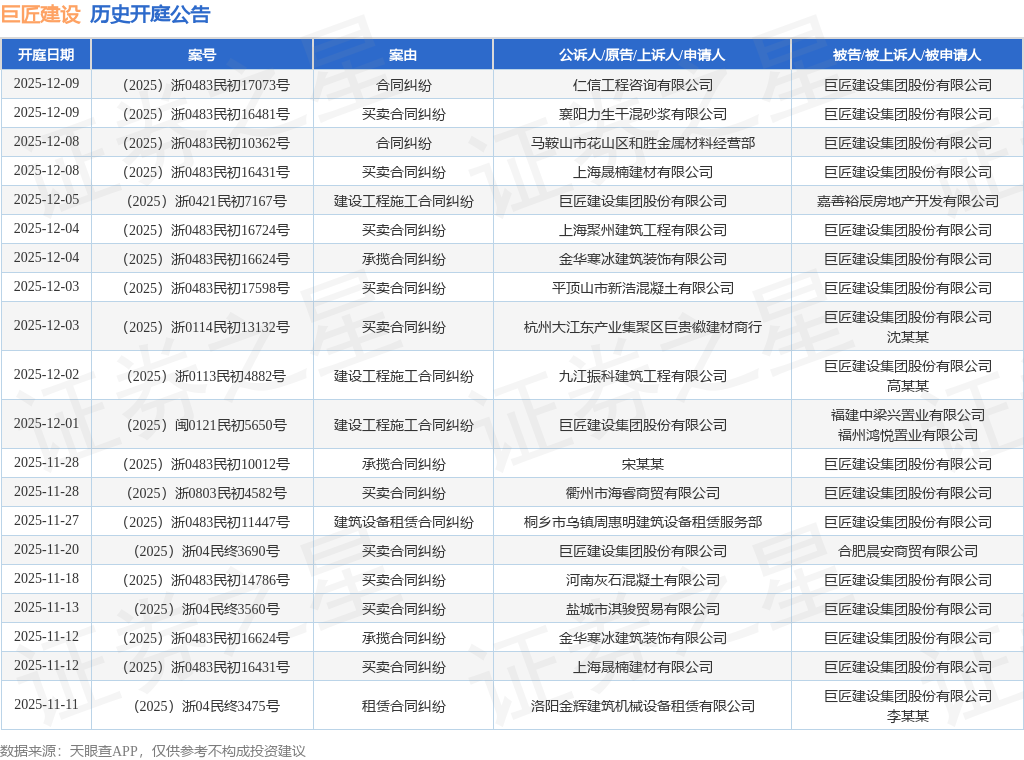 案号:(2025)浙0421民初7167号根据统计,近一年内以巨匠建设集团股份有限公司为当事人的历史开庭公告有236则,其中案由为“买卖合同纠纷”的公告以81则居首,其次为“合同纠纷”有37则,“建设工程施工合同纠纷”有30则。历史开庭公告(前20条)如下: