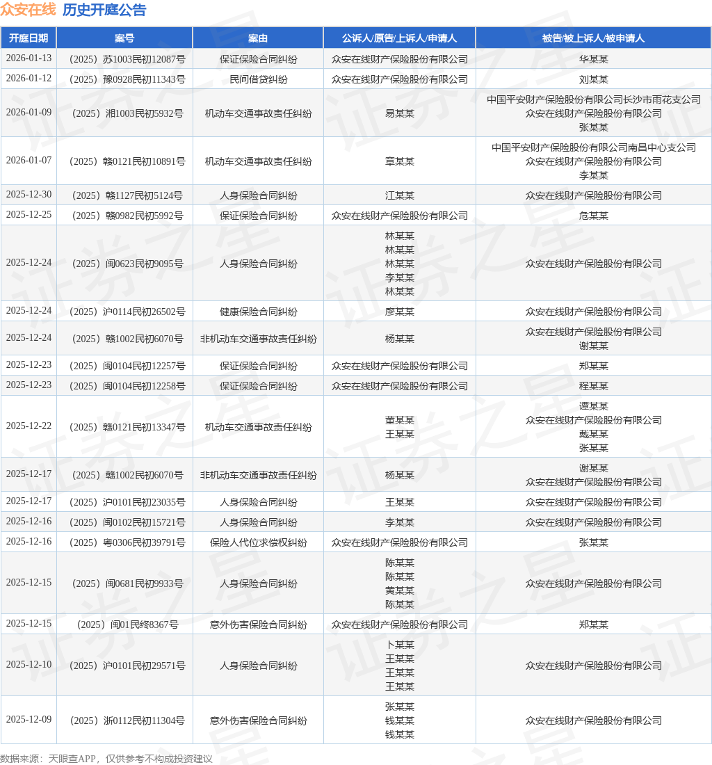 案号:(2025)闽0881民初3427号根据统计,近一年内以众安在线财产保险股份有限公司为当事人的历史开庭公告有4583则,其中案由为“保证保险合同纠纷”的公告以2959则居首,其次为“人身保险合同纠纷”有632则,“保险人代位求偿权纠纷”有287则。历史开庭公告(前20条)如下: