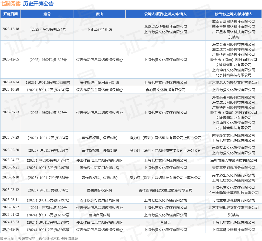 案号:(2025)浙02民初1327号根据统计,近一年内以上海七猫文化传媒有限公司为当事人的历史开庭公告有16则,其中案由为“侵害作品信息网络传播权纠纷”的公告以7则居首,其次为“著作权权属、侵权纠纷”有3则,“著作权许可使用合同纠纷”有3则。历史开庭公告如下: