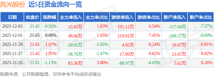 证券之星消息,截至2025年12月2日收盘,风光股份(301100)报收于21.45元,下跌0.92%,换手率0.82%,成交量7204.0手,成交额1545.9万元。