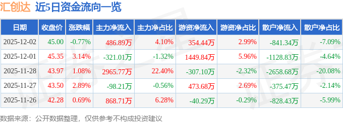 证券之星消息,截至2025年12月2日收盘,汇创达(300909)报收于45.0元,下跌0.77%,换手率2.13%,成交量2.62万手,成交额1.19亿元。