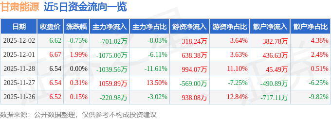 证券之星消息,截至2025年12月2日收盘,甘肃能源(000791)报收于6.62元,下跌0.75%,换手率0.68%,成交量13.19万手,成交额8731.98万元。