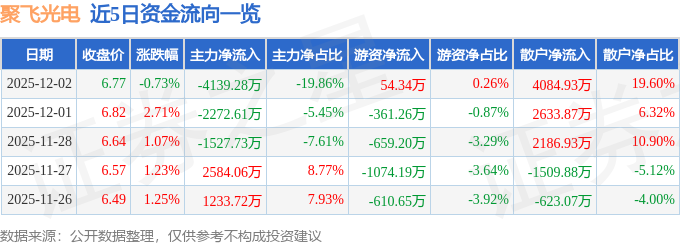 证券之星消息,截至2025年12月2日收盘,聚飞光电(300303)报收于6.77元,下跌0.73%,换手率2.32%,成交量30.81万手,成交额2.08亿元。