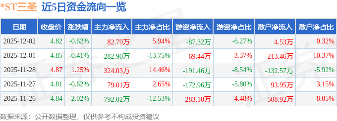 证券之星消息,截至2025年12月2日收盘,*ST三圣(002742)报收于4.82元,下跌0.62%,换手率0.67%,成交量2.89万手,成交额1393.23万元。