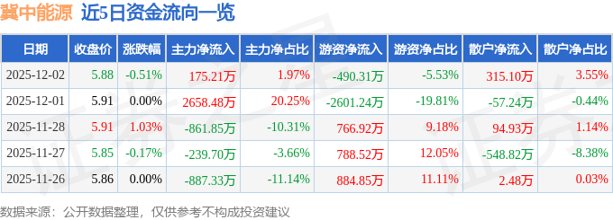 证券之星消息,截至2025年12月2日收盘,冀中能源(000937)报收于5.88元,下跌0.51%,换手率0.44%,成交量15.08万手,成交额8871.84万元。