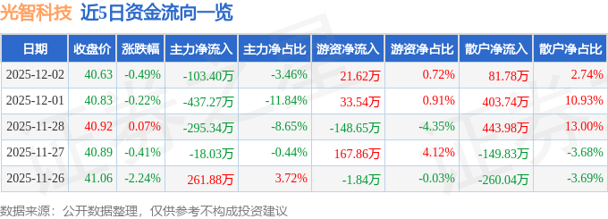 证券之星消息,截至2025年12月2日收盘,光智科技(300489)报收于40.63元,下跌0.49%,换手率0.54%,成交量7348.0手,成交额2986.46万元。