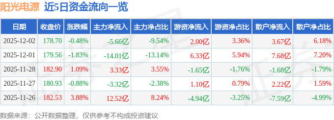 证券之星消息,截至2025年12月2日收盘,阳光电源(300274)报收于178.7元,下跌0.48%,换手率2.1%,成交量33.31万手,成交额59.32亿元。