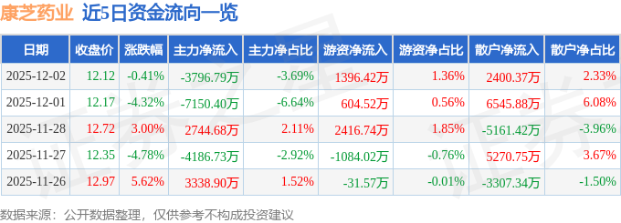 证券之星消息,截至2025年12月2日收盘,康芝药业(300086)报收于12.12元,下跌0.41%,换手率19.81%,成交量87.29万手,成交额10.3亿元。