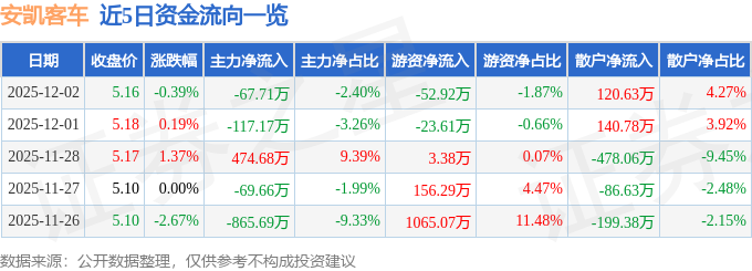 证券之星消息,截至2025年12月2日收盘,安凯客车(000868)报收于5.16元,下跌0.39%,换手率0.75%,成交量5.48万手,成交额2823.64万元。