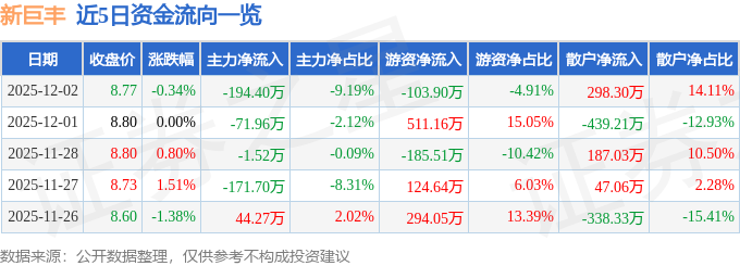 证券之星消息,截至2025年12月2日收盘,新巨丰(301296)报收于8.77元,下跌0.34%,换手率0.83%,成交量2.4万手,成交额2114.64万元。
