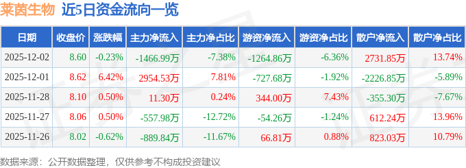 证券之星消息,截至2025年12月2日收盘,莱茵生物(002166)报收于8.6元,下跌0.23%,换手率3.12%,成交量23.11万手,成交额1.99亿元。