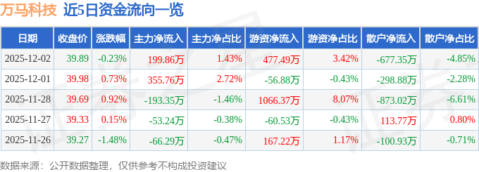 证券之星消息,截至2025年12月2日收盘,万马科技(300698)报收于39.89元,下跌0.23%,换手率2.95%,成交量3.49万手,成交额1.4亿元。