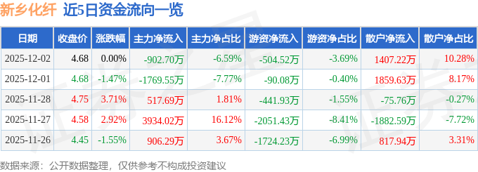 证券之星消息,截至2025年12月2日收盘,新乡化纤(000949)报收于4.68元,上涨0.0%,换手率1.73%,成交量29.36万手,成交额1.37亿元。