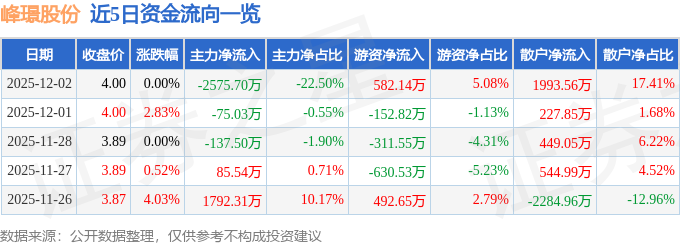 12月2日的资金流向数据方面,主力资金净流出2575.7万元,占总成交额22.5%,游资资金净流入582.14万元,占总成交额5.08%,散户资金净流入1993.56万元,占总成交额17.41%。