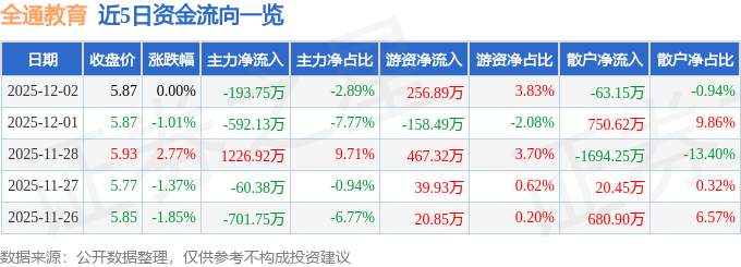 证券之星消息,截至2025年12月2日收盘,全通教育(300359)报收于5.87元,上涨0.0%,换手率1.81%,成交量11.46万手,成交额6700.23万元。
