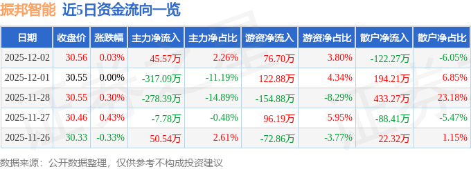 证券之星消息,截至2025年12月2日收盘,振邦智能(003028)报收于30.56元,上涨0.03%,换手率0.93%,成交量6595.0手,成交额2019.85万元。