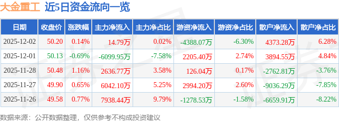 证券之星消息,截至2025年12月2日收盘,大金重工(002487)报收于50.2元,上涨0.14%,换手率2.22%,成交量14.03万手,成交额6.97亿元。
