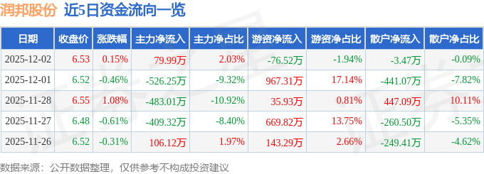 证券之星消息,截至2025年12月2日收盘,润邦股份(002483)报收于6.53元,上涨0.15%,换手率0.68%,成交量6.06万手,成交额3947.2万元。