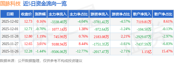 证券之星消息,截至2025年12月2日收盘,国脉科技(002093)报收于12.73元,上涨0.16%,换手率6.49%,成交量65.42万手,成交额8.27亿元。