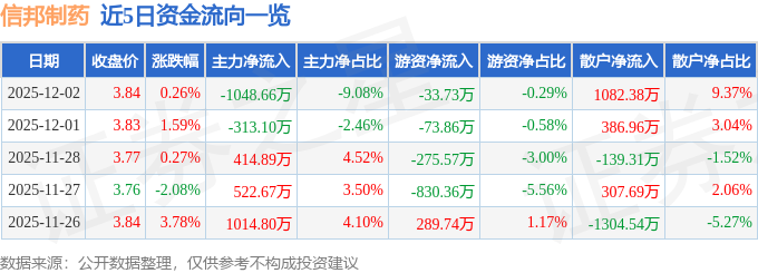 证券之星消息,截至2025年12月2日收盘,信邦制药(002390)报收于3.84元,上涨0.26%,换手率1.57%,成交量30.22万手,成交额1.16亿元。