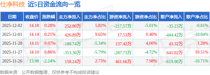证券之星消息,截至2025年12月2日收盘,仕净科技(301030)报收于14.18元,上涨0.28%,换手率1.52%,成交量3.07万手,成交额4346.36万元。