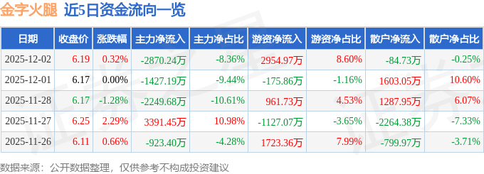 证券之星消息,截至2025年12月2日收盘,金字火腿(002515)报收于6.19元,上涨0.32%,换手率4.54%,成交量54.94万手,成交额3.43亿元。