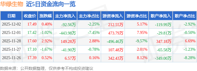 证券之星消息,截至2025年12月2日收盘,华绿生物(300970)报收于17.49元,上涨0.4%,换手率2.48%,成交量2.36万手,成交额4108.18万元。
