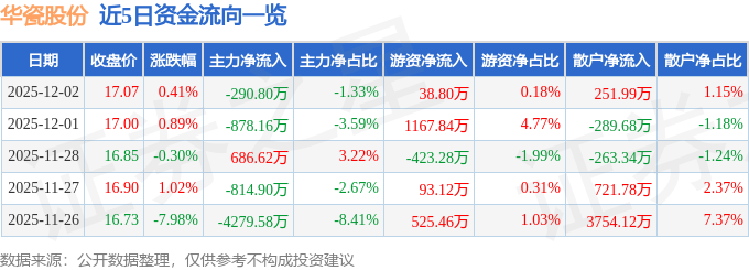 证券之星消息,截至2025年12月2日收盘,华瓷股份(001216)报收于17.07元,上涨0.41%,换手率5.27%,成交量12.93万手,成交额2.19亿元。