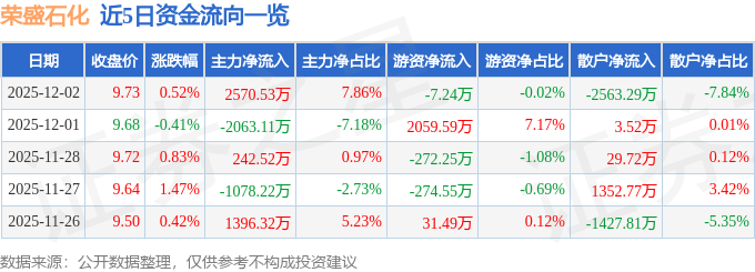 证券之星消息,截至2025年12月2日收盘,荣盛石化(002493)报收于9.73元,上涨0.52%,换手率0.36%,成交量33.33万手,成交额3.27亿元。