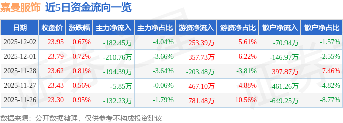 证券之星消息,截至2025年12月2日收盘,嘉曼服饰(301276)报收于23.95元,上涨0.67%,换手率4.12%,成交量1.9万手,成交额4518.9万元。