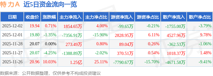 证券之星消息,截至2025年12月2日收盘,特 力A(000025)报收于19.94元,上涨0.71%,换手率5.96%,成交量23.39万手,成交额4.64亿元。