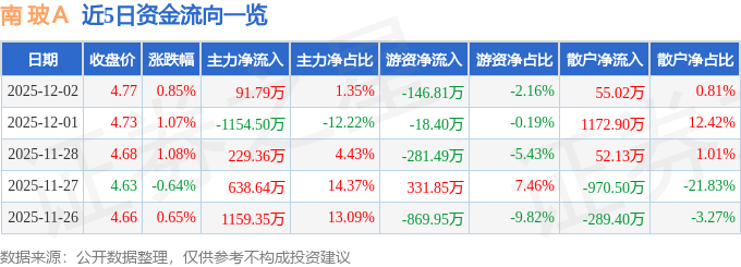 证券之星消息,截至2025年12月2日收盘,南 玻A(000012)报收于4.77元,上涨0.85%,换手率0.73%,成交量14.35万手,成交额6812.16万元。
