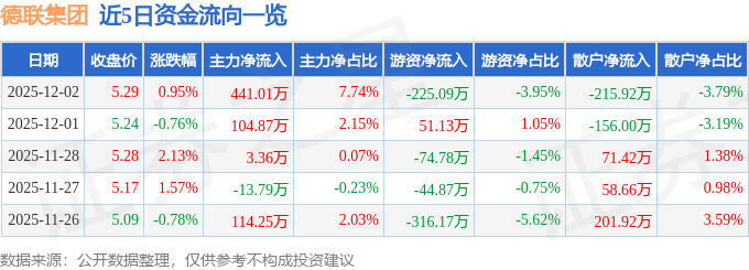 证券之星消息,截至2025年12月2日收盘,德联集团(002666)报收于5.29元,上涨0.95%,换手率2.16%,成交量10.84万手,成交额5700.77万元。